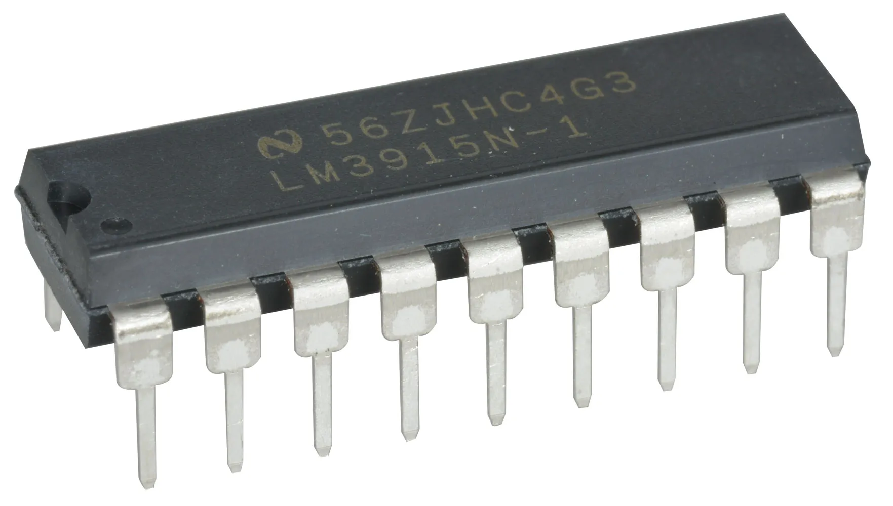 The LM3915 is a monolithic integrated circuit that senses analog voltage levels and drives ten LEDs, LCDs or vacuum fluorescent displays, providing a logarithmic 3 dB/step analog display. One pin changes the display from a bar graph to a moving dot display. LED current drive is regulated and programmable, eliminating the need for current limiting resistors. The whole display system can operate from a single supply as low as 3V or as high as 25V.Features