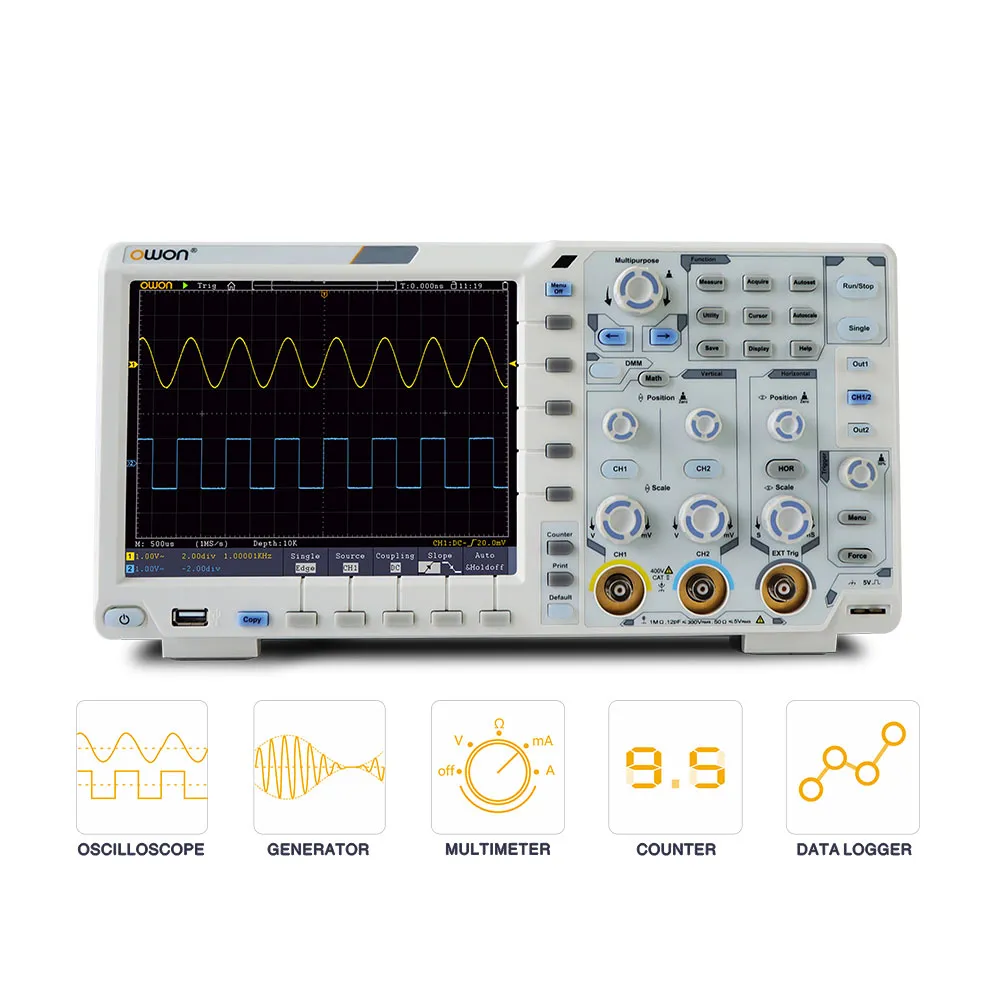 - N-in-1: Functions as oscilloscope, DMM, 1-CH arbitrary waveform generator and datalogger