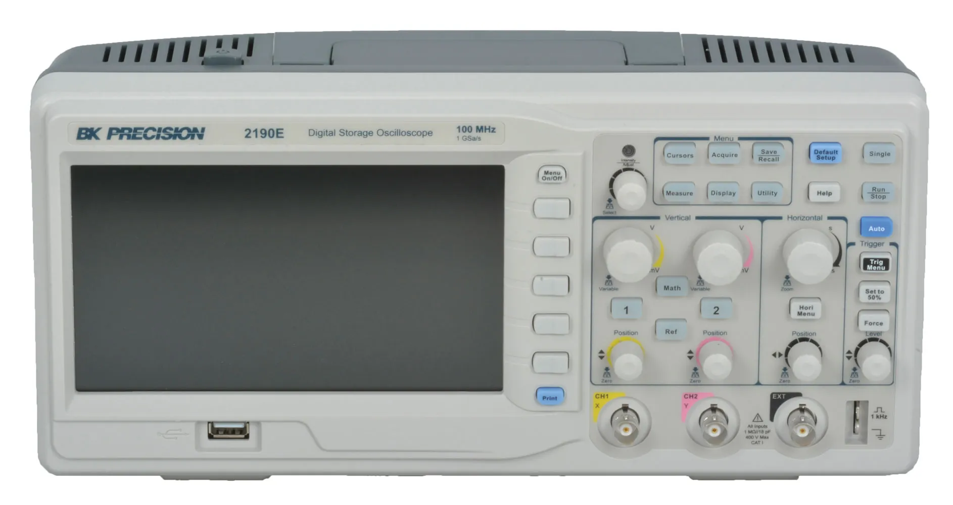 The 2190E combines performance and value all in one portable solution. With 100 MHz bandwidth and 1 GSa/s sample rate, these oscilloscopes offer advanced triggering capabilities, long waveform memory up to 40,000 points, and extensive features such as pass/fail limit testing, digital filtering, waveform recorder, and 32 automatic measurements.Engineered to allow you to see more of your signal under test, the 2190E widescreen 7" TFT display offers a significantly larger viewing area than typical economy oscilloscopes (5.7").