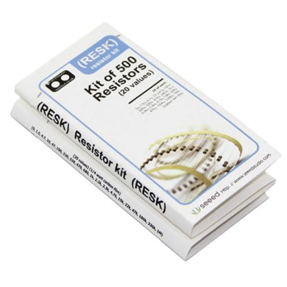 A great kit of 500 resistors with nicely organized. With 25 resistors of 20 different values, All of these resistors are stapled into a tri-fold pack and clearly labeled. The back of the resistor kit even has a resistor color code look-up chart and a table of color codes for the included resistors! You'll never need to put a project on hold because of a missing resistor.Features