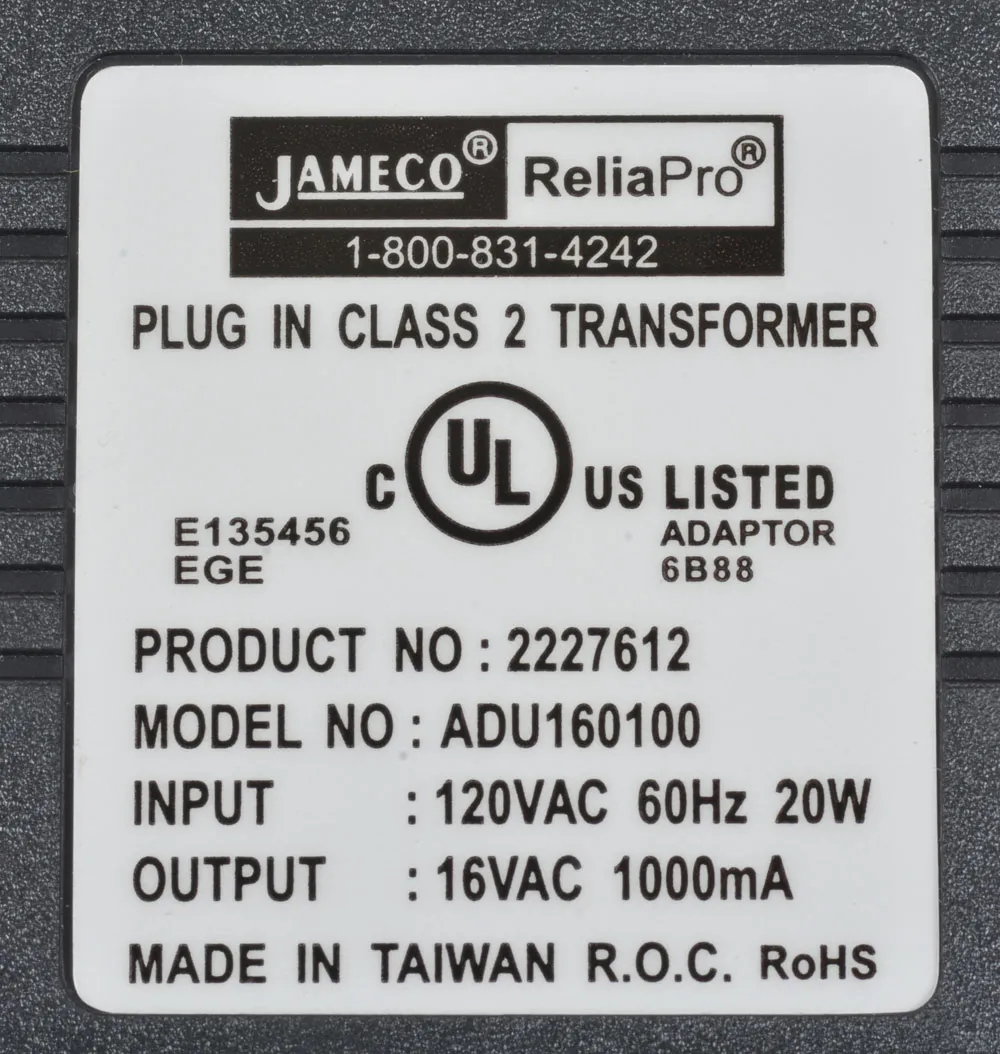 16 VAC 1 Amp 16 Watt AC Wall Adapter