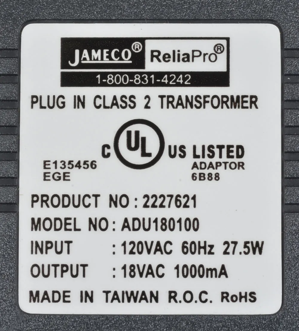 18 VAC 1 Amp 18 Watt AC Wall Adapter