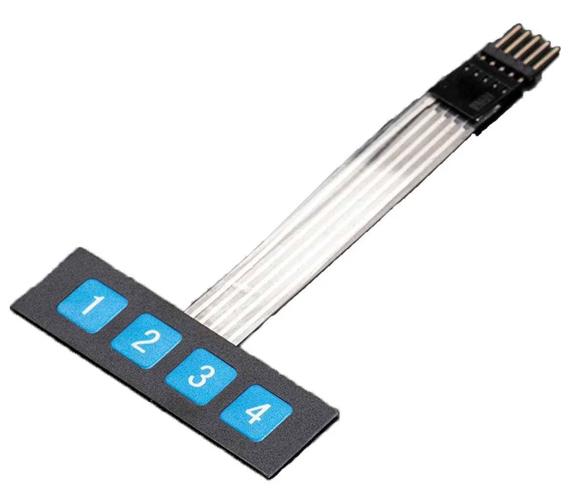 Enter your secret key into this numeric membrane keypad. This keypad has 4 buttons, and since every key has its own wire line, no matrix code is required; just treat these like every day switches. The membrane is soft and has a removable paper backing to expose a strong adhesive, so you can stick this on an enclosure and feed the cable through a slot. It's a simple keypad, but that's why everyone likes it.It comes with a 5-pin extra-long header strip so you can plug this into a breadboard with ease.