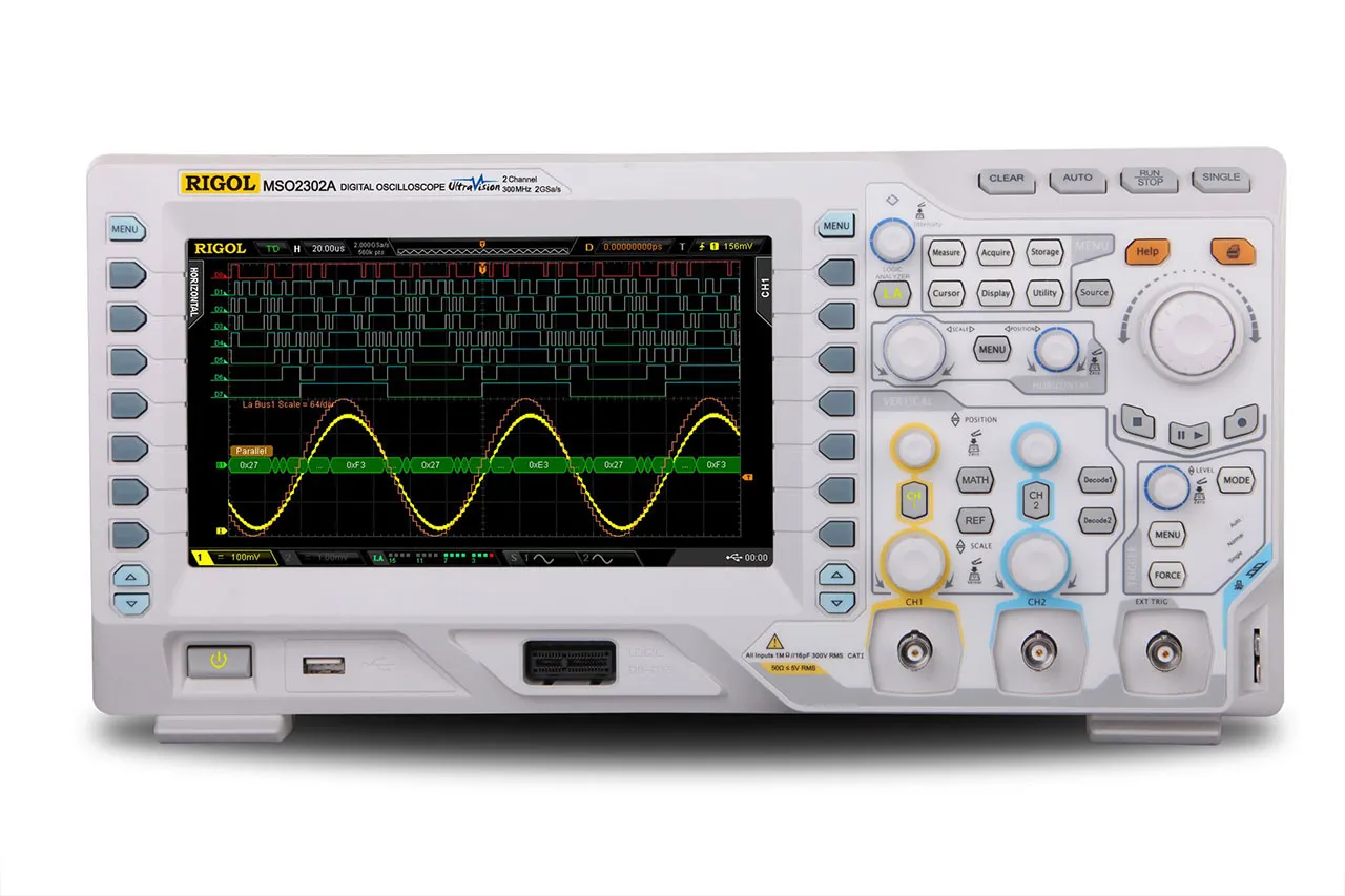 This is a 2 Channel Mixed Signal Oscilloscope from Rigol. It has a 300 MHz bandwidth, 2 GSa/sec sample rate, 14 Mpts Memory Standard, Low Noise Front End, and includes a 50 Ohm input.