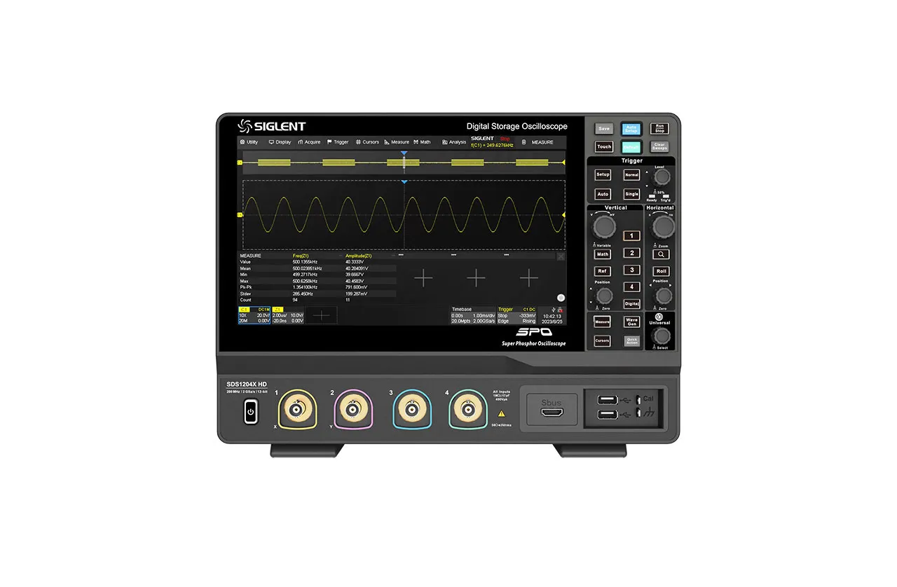 The SDS1000X HD series utilizes Siglent’s SPO technology with a waveform capture rate up to 120,000 wfm/ s (normal mode, up to 500,000 wfm/s in Sequence mode), 256-level intensity grading display function and a color temperature display mode. It also has an innovative digital trigger system with high sensitivity and low jitter. The trigger system supports multiple powerful triggering modes including serial bus triggering. Tools like History waveform recording, Search and Navigate functions, Mask Test, Bode Plot, Power Analysis and allows for extended waveform records to be captured, stored, and analyzed. It also has an impressive array of measurement and math capabilities, options for a 25 MHz arbitrary waveform generator, as well as serial decoding are also some of the SDS1000X HD features.