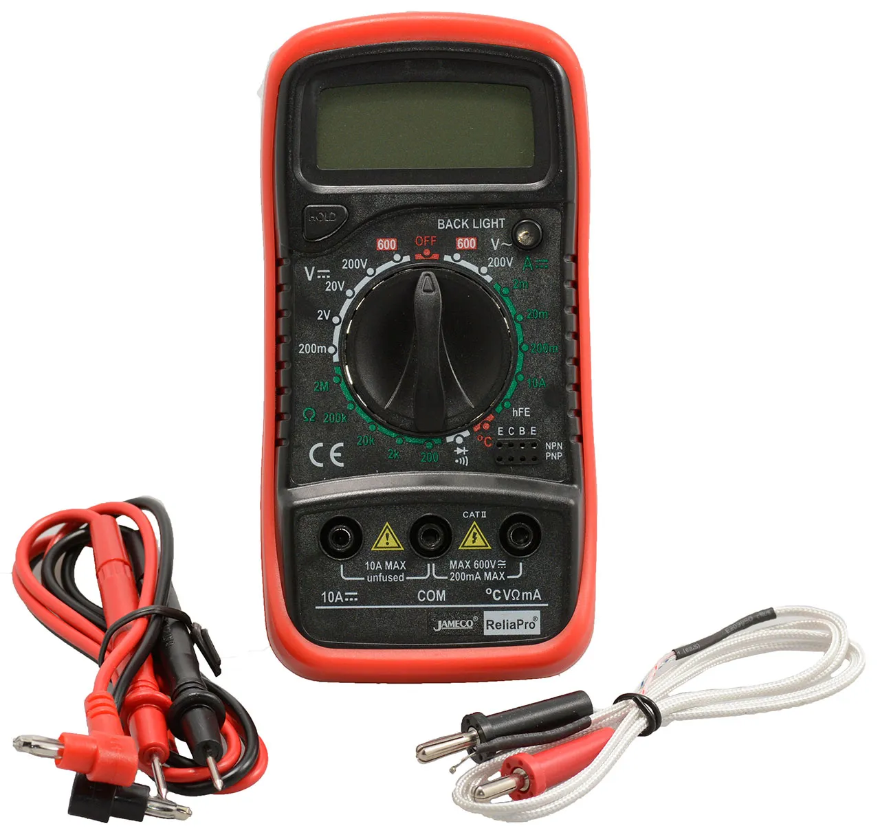 - 8 Functions: DCV, ACV, DCA, Resistance, Diode Test, Continuity, hFE transistor, Temperature