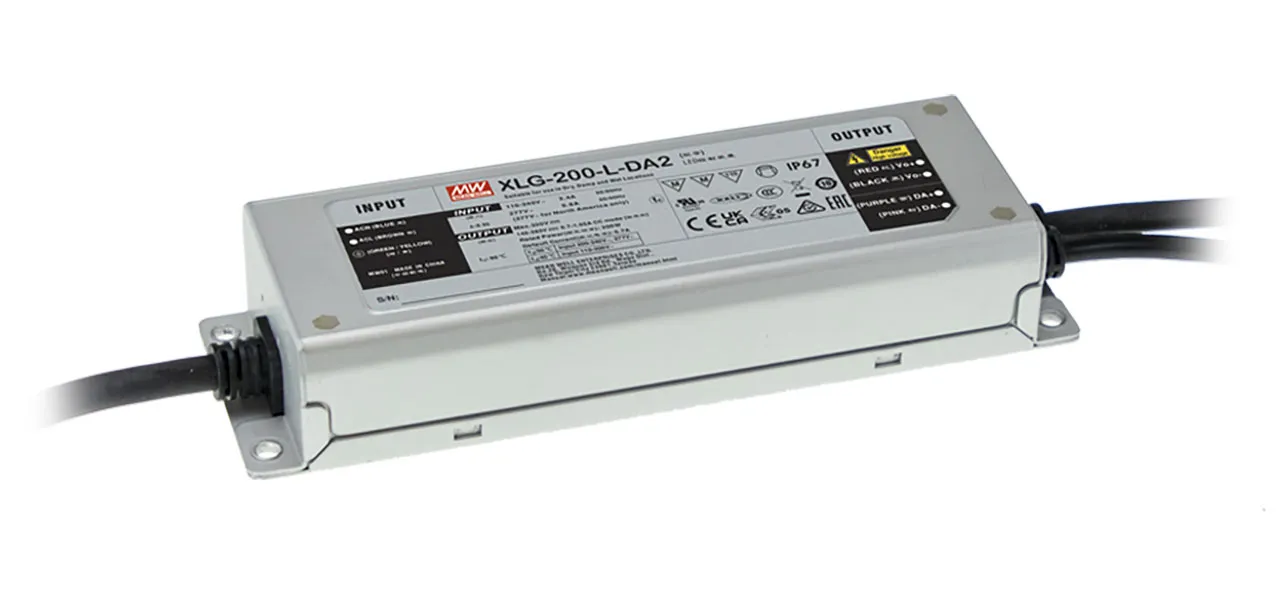 The XLG-200-DA2 series is a 200 watt AC/DC LED driver featuring the constant power mode output with DALI-2 dimming. It operates from 100 to 305 VAC. Thanks to the high efficiency with the fanless design, the entire series is able to operate between -40C and 90C wide case temperature range with air convection. The metal housing design and IP67 ingress protection level allows this series to fit both indoor and outdoor applications.