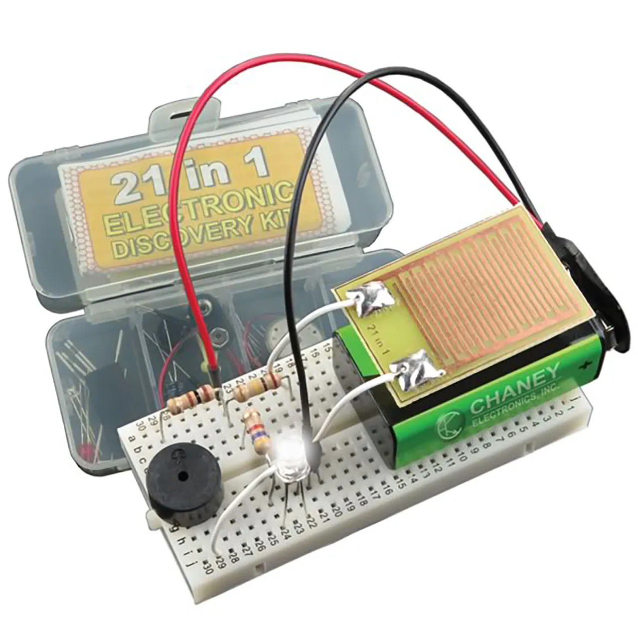 21 in 1 Electronic Discover Kit This is the perfect lab for anyone interested in discovering basic electronic components and electronic circuitry. This kit consists of a re-usable no solder breadboard and various electronic components including a buzzer, motor, capacitor, CDS cell, resistors and LEDs. Not only do you discover circuits that use these components, you'll also make many fun functional projects. This kit does not require any soldering and is self contained in a reclosable 5.75" x 2.5" x 2" plastic storage box with small booklet.