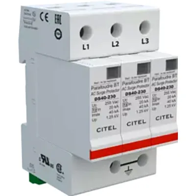 This surge protection device (SPD) designed for 230 or 400 VAC 2-phase+N AC Power circuits and uses MOV technology. It features 40kA surge current rating per module and is UL1449 Type 4AC. It has a visual fault indicator, remote contacts, and comes with a 10-year warranty.Specifications