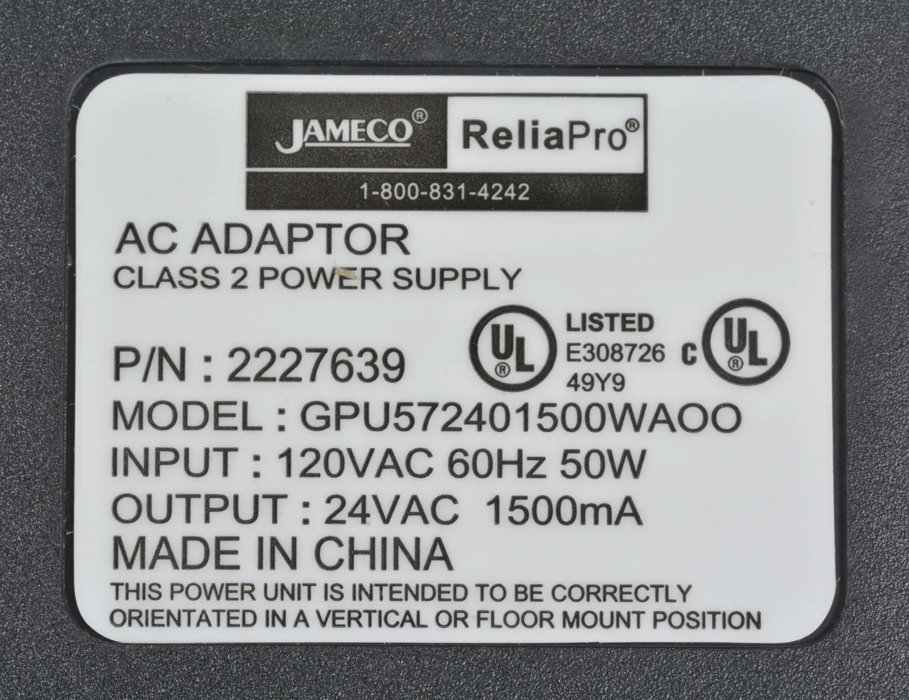 24 VAC 1.5 Amp 36 Watt AC Wall Adapter