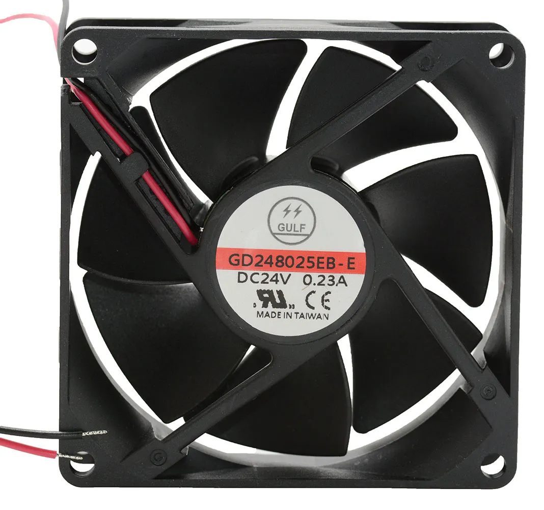 This 80x80x25mm tubeaxial fan features dual ball bearing and a brushless motor that operates at 24 VDC. Current consumption averages 140 mA, and the fan provides a typical airflow of 54.5 CFM at 38.4 dB(A).