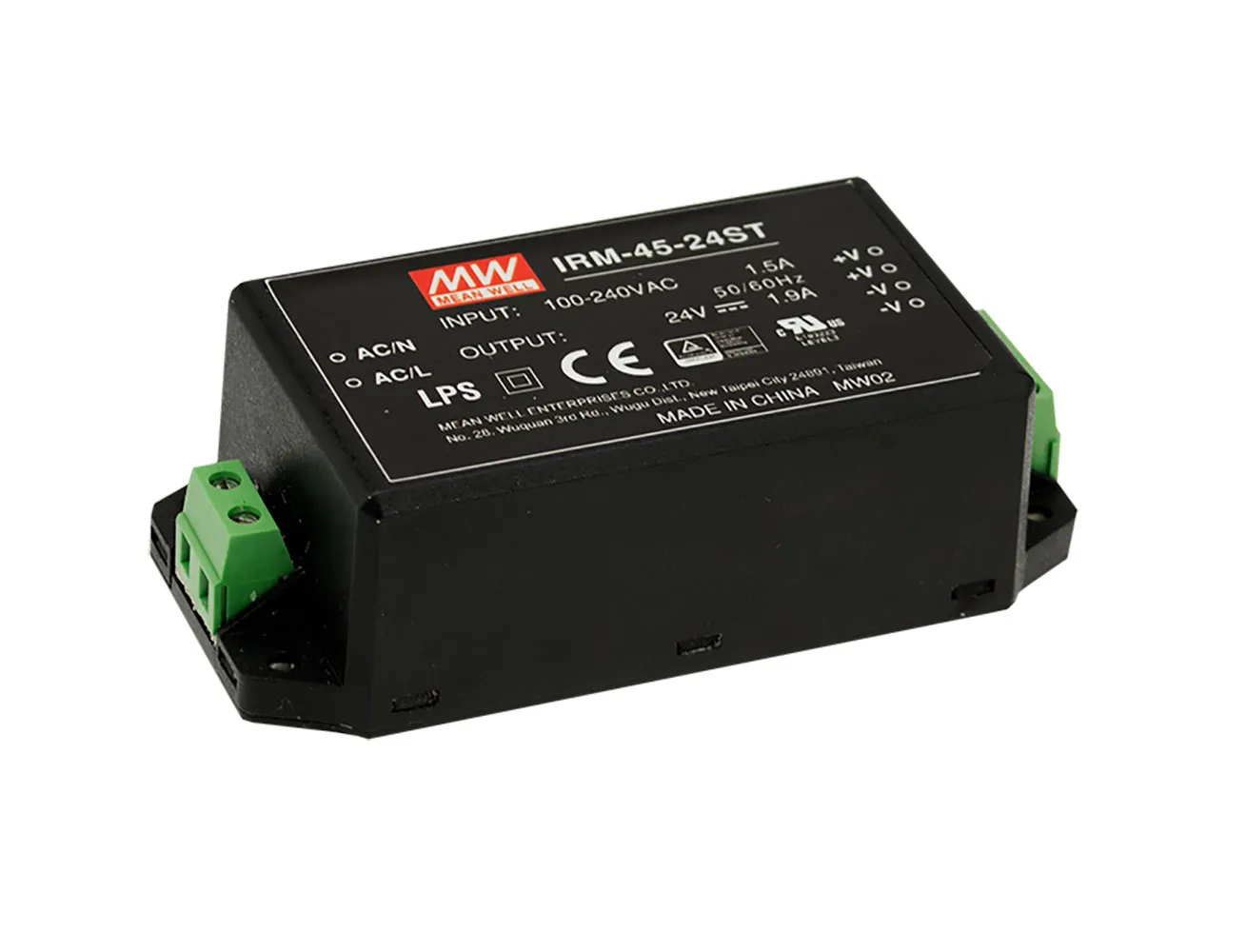 24 Volts @ 1.9 AmpsIRM-45 is a 45W miniature AC-DC module-type power supply ready to be soldered onto the PCB boards of various kinds of electronic instruments or industrial automation equipment. This product allows the universal input voltage range of 85-264VAC. The 94V-0 flame retardant plastic case and the fully-potted silicone enhance the heat dissipation and meet the anti-vibration demand up to 5G, while also providing the fundamental resistance to dust and moisture.