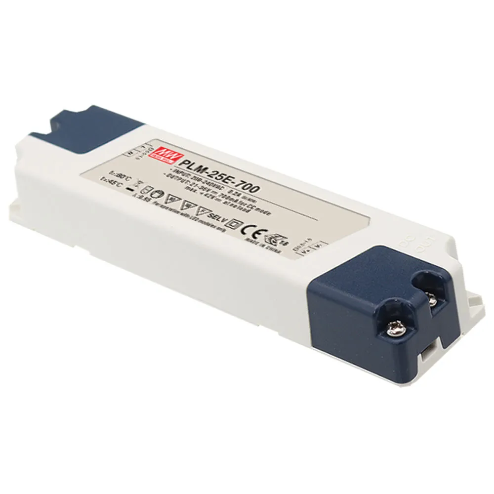 500 mA, Constant Current Region: 30V - 50VThe PLM-25E is a 25 watt economical AC/DC LED power supply series. Incorporating built-in active PFC, the PLM-25E provides a high power factor value greater than 0.9. In addition to the low no load power consumption below 0.5 watts, and the setup time less than 500ms, the PLM-25E complies with the ErP regulation required by European Union for lighting fixtures.