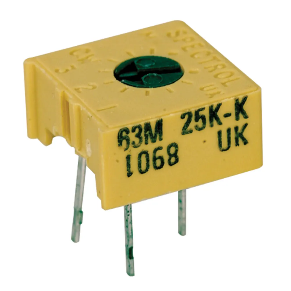 Resistance: 100Ω to 25kΩTolerance: 10%Power rating: 0.5W @ 70°CSingle turnInsulation resistance: 1000MΩ min.Operating temperature range: -55°C to +125°CSize: 0.375"L x 0.375"W x 0.19"HTop adjustmentConnection: Solder pins