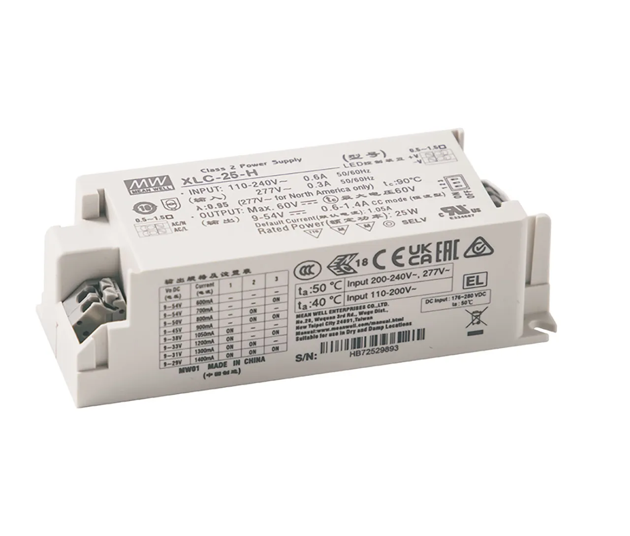 XLC-25 series is a 25 watt constant voltage output LED driver. It can operate from 100 VAC to 305 VAC and with high efficiency up to 88% over a temperature range from -25°C to 85°C under free air convection. The XLC-25 is designed based on the latest safety regulations with 3-in-1 and DALI-2 dimming options available. XLC-25 can also be adjusted for brightness with a push button as a simple way of dimming, so it provides more flexibility for LED lighting applications.
