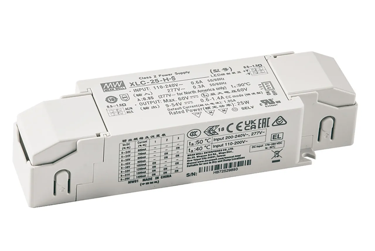 XLC-25 series is a 25 watt constant voltage output LED driver. It can operate from 100 VAC to 305 VAC and with high efficiency up to 88% over a temperature range from -25°C to 85°C under free air convection. The XLC-25 is designed based on the latest safety regulations with 3-in-1 and DALI-2 dimming options available. XLC-25 can also be adjusted for brightness with a push button as a simple way of dimming, so it provides more flexibility for LED lighting applications.