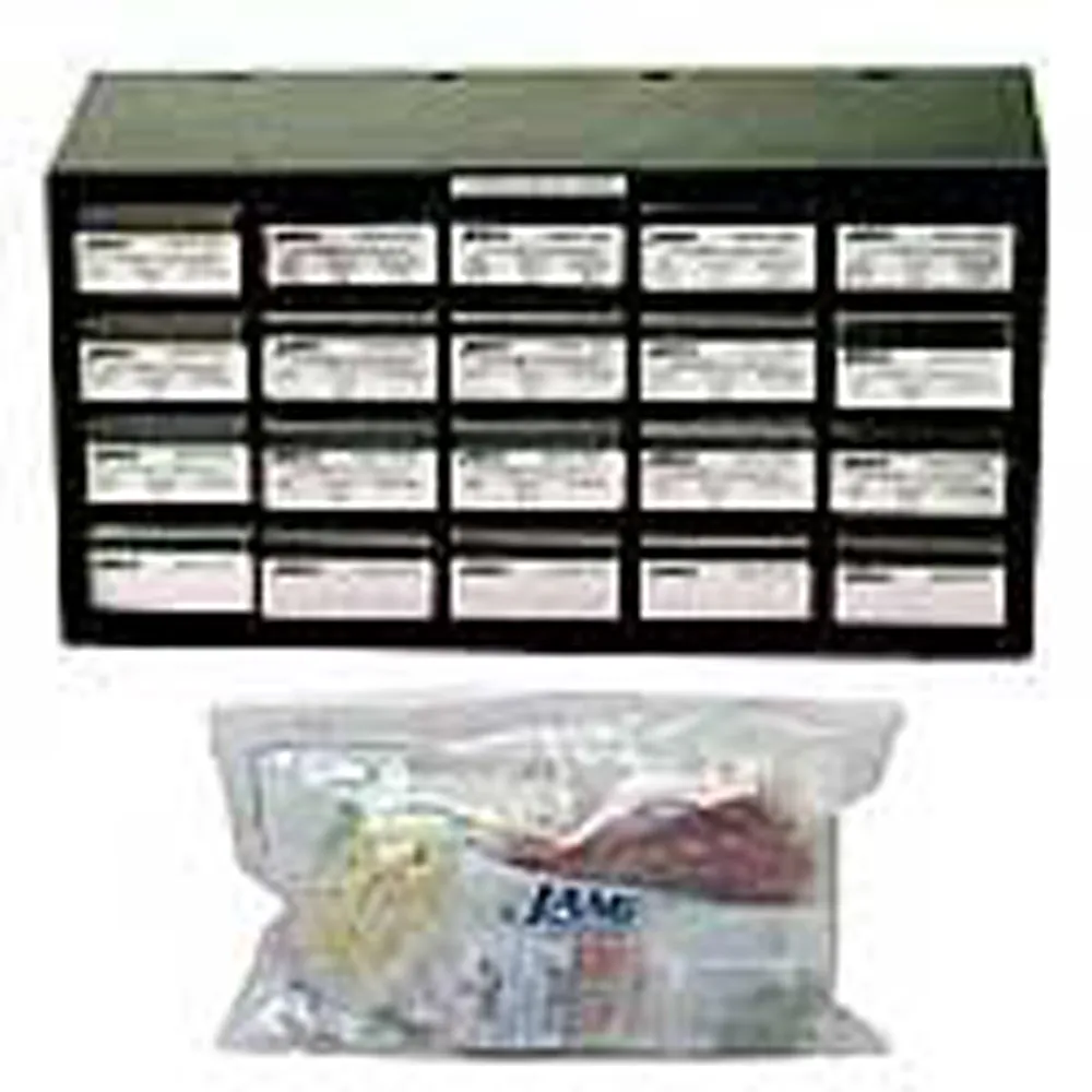 280 pieces, (10 types)Each kit includes a drawer component cabinet (319600), 20 drawers (319601), and 20 plastic dividers (319611). It also includes identification labels for each drawer, blank adhesive labels for empty drawers, and has reorder numbers to replenish stock.