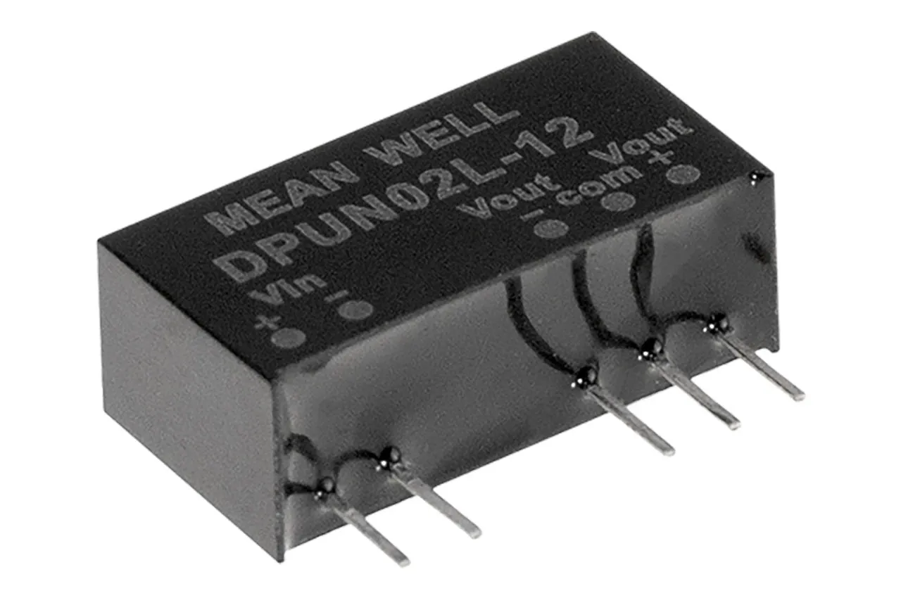 The SPUN02 and DPUN02 series are 2-watt isolated and unregulated PCB module type DC-DC converters with industry standard SIP7 package. It features international standard pins, a high efficiency up to 87%, a wide working temperature range, 3KV DC I/P-O/P isolation voltage, complies with BS EN/EN55032 radiated Class A without additional components, short circuit protection, and more.The models accommodate different input voltages of 5V/12V/24V ±10%, and various output voltages of 5V/12V/15V for single output and ±5V/±12V/±15V for dual outputs, which are suitable for all kinds of systems such as industrial control, telecommunication field, distributed power architecture, and so on.