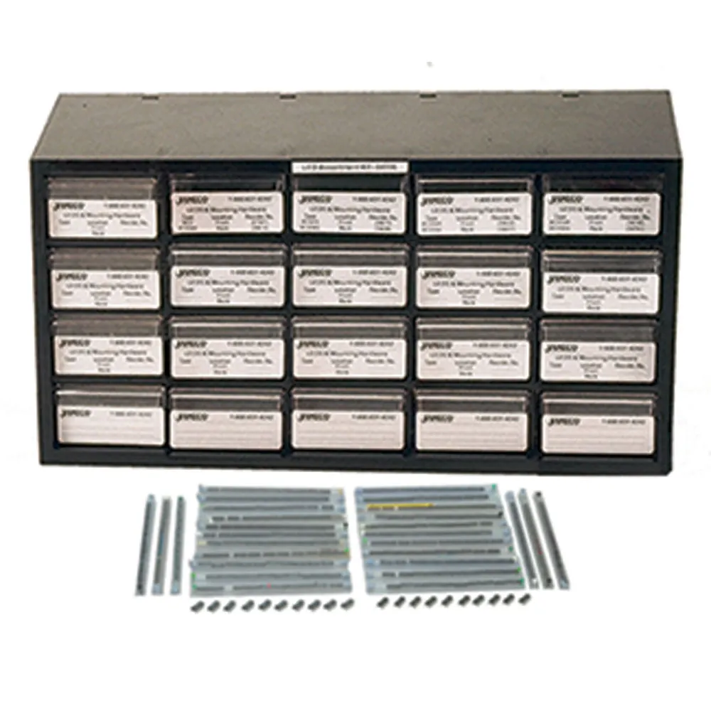 This kit offers a savings value over 30% compared to buying all components separately. The kit includes a 20 Drawer Component Cabinet (P/N 319600), 20 clear plastic drawers (P/N 319601), 20 clear dividers (P/N 319611), 30 adhesive labels for drawers to identify parts in kit, and all the Electronic Components listed in each kit.