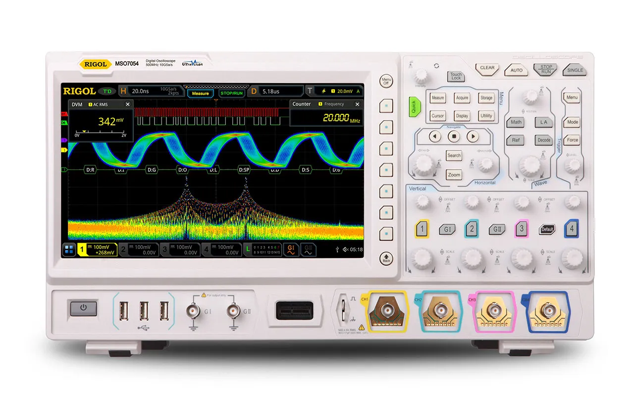 This is a 4 Digital Oscilloscope from Rigol. It has a 500 MHz bandwidth and a 10 GSa/sec sample rate.