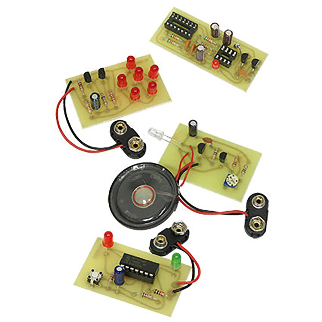 If you are introducing soldering kits to your students, you'll want this value packed 4 in 1 package. The student starts by following detailed instructions on "how to solder" and builds a non-functional "learn to solder kit" which includes a PC board and all parts. After he or she has gained the skills necessary to solder properly, the student progresses on to each of the 3 exciting kits listed below. Each one operates on its own and can be mounted in an optional box if the student desires. At the conclusion, the student has built 1 non-functional kit and 3 fully operating kits that he/she can enjoy. All kits are Skill Level 1 and come complete with all parts, PC board and instructions. Each kit (except the non-functional Learn to Solder Kit) operates from a 9V battery (not included).