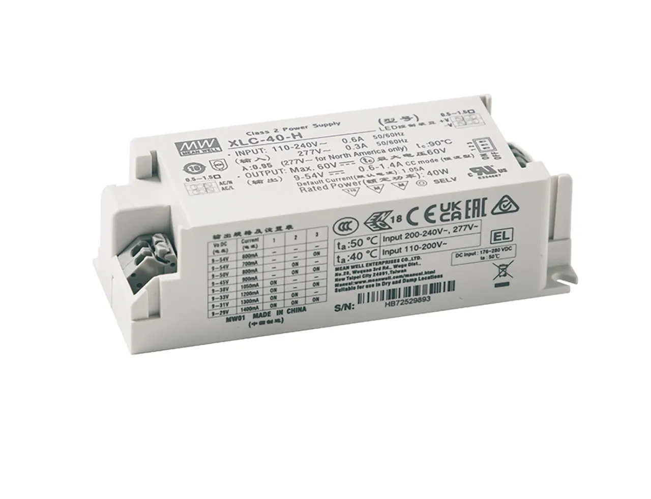 XLC-40 series is a 40 watt constant power output LED driver. It can operate from 100 VAC to 305 VAC and output current ranging between 600 mA to 1400 mA selctable by NFC. Thanks to high efficiency up to 88%, it can operate over a temperature range from -40°C to 90°C under free air convection. The XLC-40 is designed based on the latest safety regulations with 3-in-1 and DALI-2 dimming options available. XLC-40 can also be adjusted for brightness with a push button as a simple way of dimming, so it provides more flexibility for LED lighting applications.