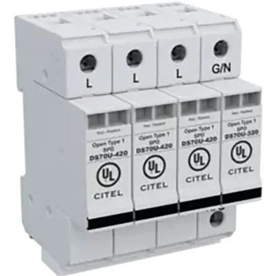 This surge protection device (SPD) designed for 480 or 277 VAC 3-phase AC Power circuits and uses Multi-MOV technology. It features 75kA surge current rating per module and is UL1449 Type 1 listed. It has a visual fault indicator, remote contacts, and comes with a 10-year warranty.Specifications