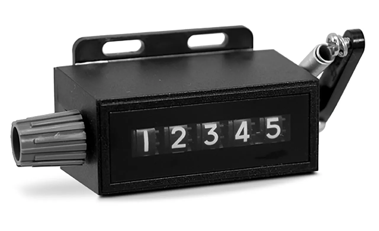 5 digit electromechanical stroke counter, right handed, top coming count direction, reset knob.
