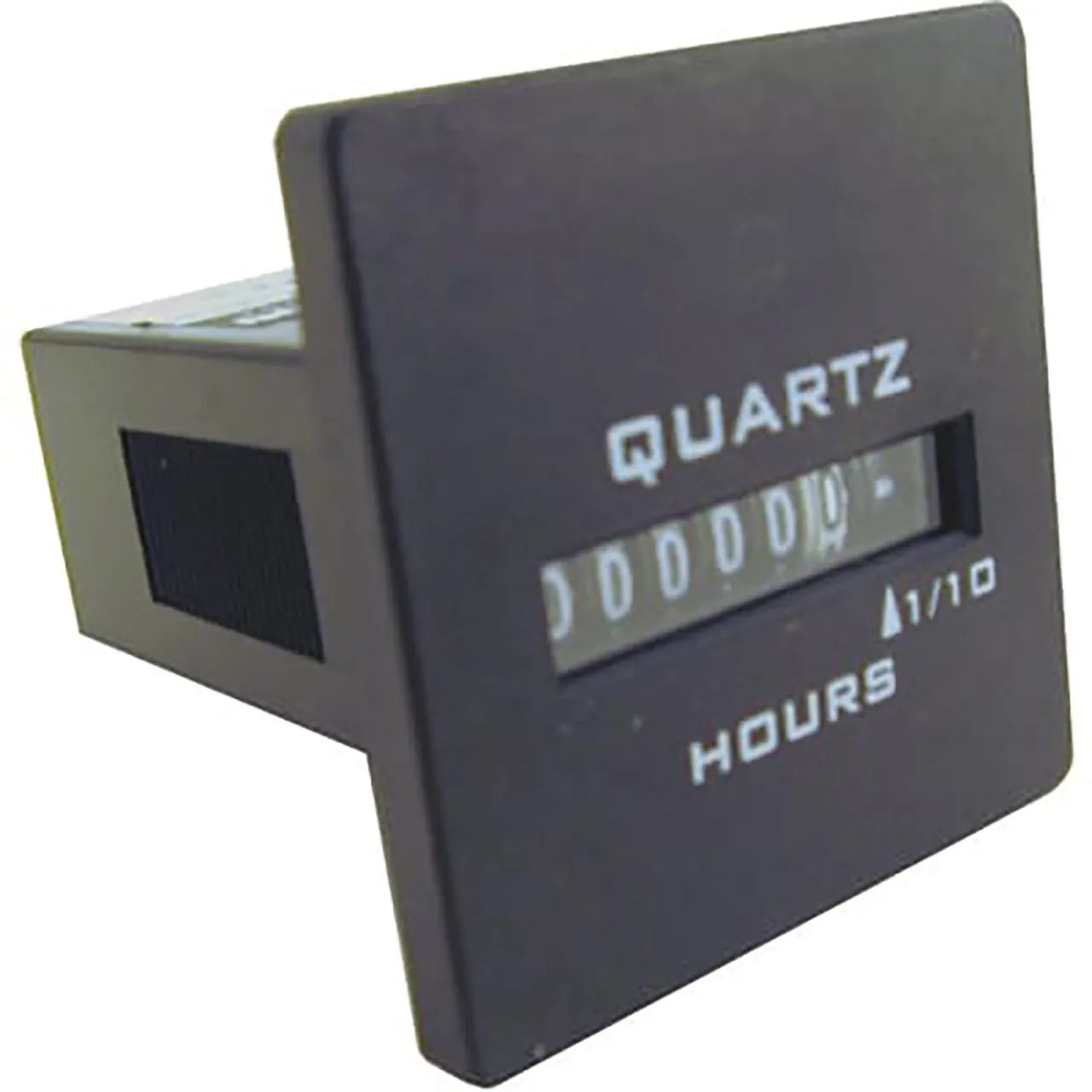 6 digit electromechanical hour meter, 90-264 VAC, square 1.9" housing, 1/4" spade terminals, quartz timing.
