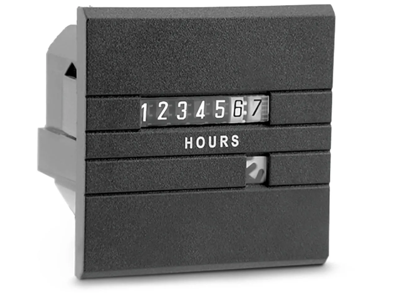 7 digit electromechanical hour meter, 24 VAC, 60Hz, square (1.89" x 1.89") housing, 1/4" spade terminals.