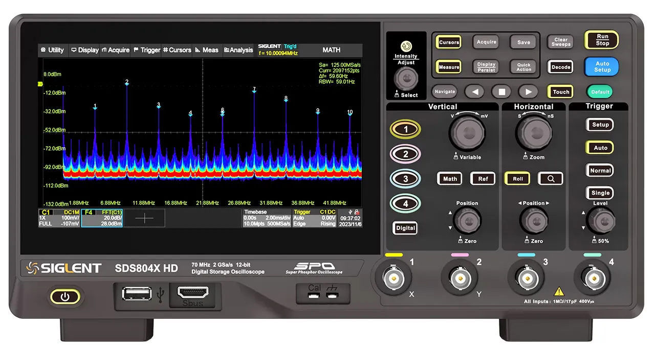 The SDS800X HD series utilizes Siglent’s SPO technology with a waveform capture rate up to 120,000 wfm/ s (normal mode, up to 500,000 wfm/s in Sequence mode), 256-level intensity grading display function and a color temperature display mode. It also has an innovative digital trigger system with high sensitivity and low jitter. The trigger system supports multiple powerful triggering modes including serial bus triggering. Tools like History waveform recording, Search and Navigate functions, Mask Test, Bode Plot, Power Analysis and allows for extended waveform records to be captured, stored, and analyzed. It also has an impressive array of measurement and math capabilities, options for a 25 MHz arbitrary waveform generator, as well as serial decoding are also some of the SDS1000X HD features.