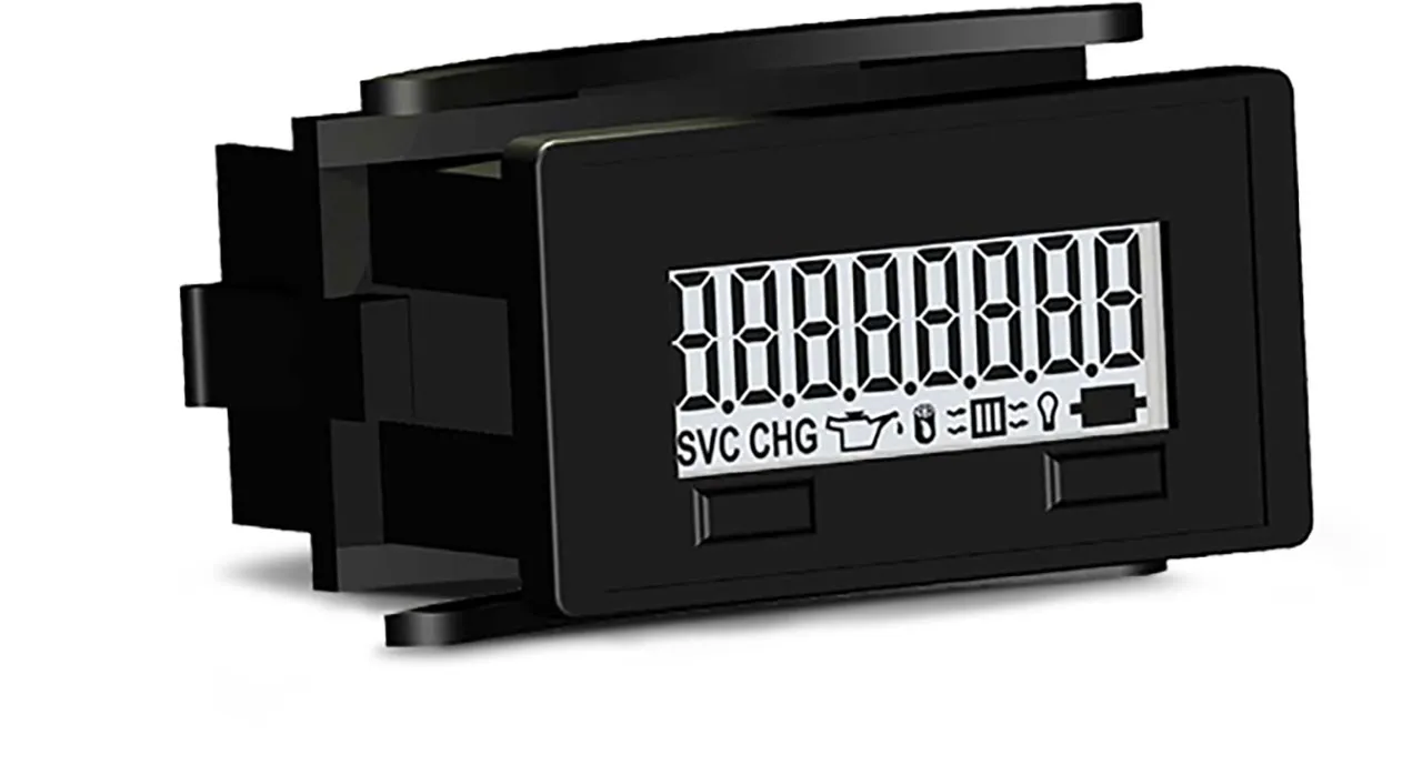 8 digit LCD hour meter, dry contact input (40/150Hz), remote reset, 1/32nd DIN housing.