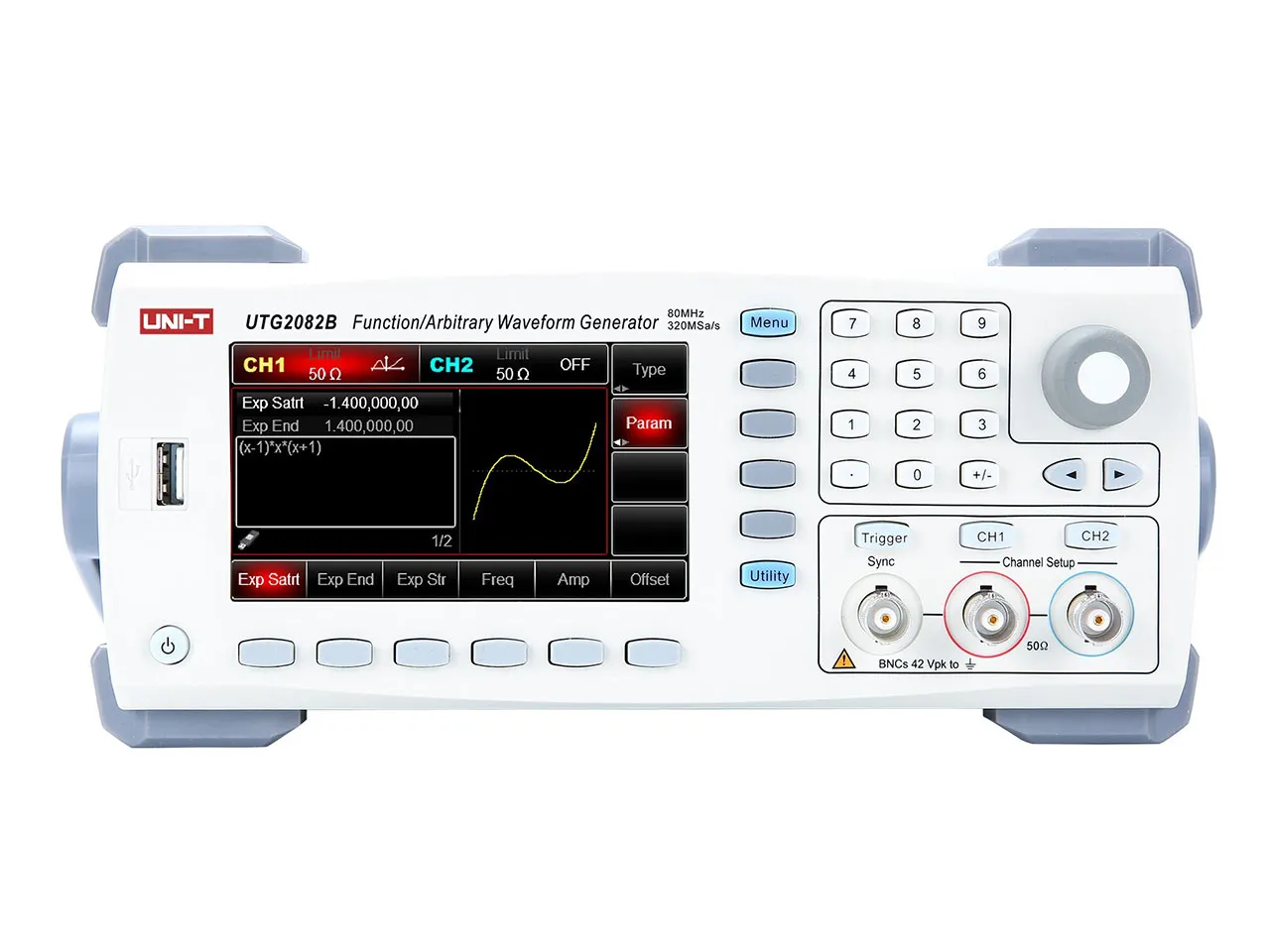 - 80MHz, 2 channels, 320MS/s, Memory Depth: 16Mpts, 4.3in display, USB. Modulations: AM, FM, PM, ASK, FSK, PSK, BPSK, QPSK, OSK, PWM, SUM, QAM, DSB-AM