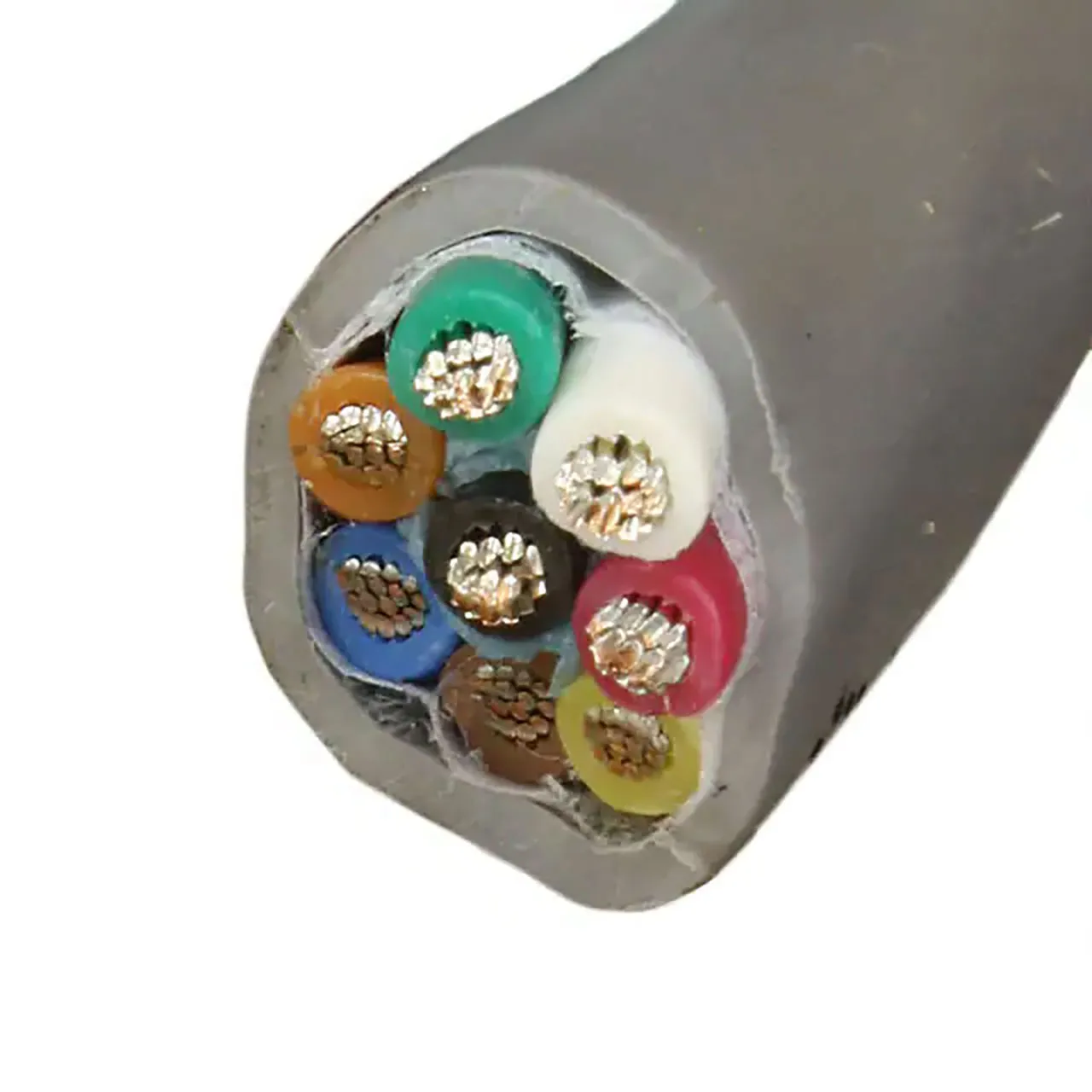 Multi-conductor cable contains individually jacketed conductors within an overall PVC jacket. This model features eight 24 AWG conductors and is shielded with 100% aluminum foil coverage with 25% overlap with an annealed stranded tin copper drain wire.