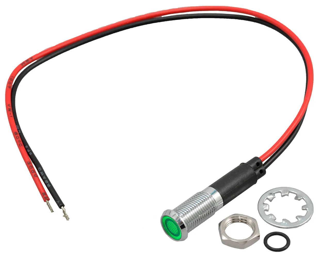 8mm LED Panel Mount Indicator Green 12 VDC Chrome Bezel 20cm Wires