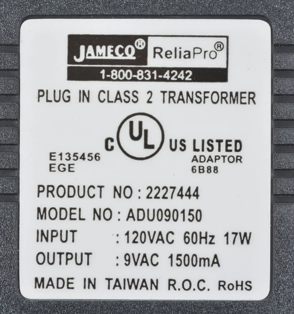 9 Volt 1.5 Amp 13.5 Watt AC-AC Wall Adapter