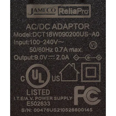 9 Volt 2 Amp 18 Watt Regulated Switching Wall Adapter 2.1mm Plug