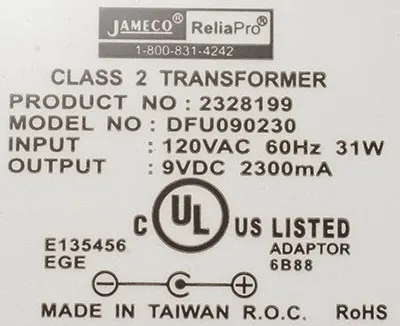 9 Volt DC 2.3 Amp 21 Watt Unregulated Linear Wall Adapter 2.1mm Plug