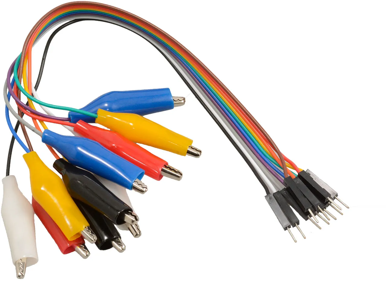 - 10 piece set, color coded vinyl covered 1.25" alligator clips on one end, and 8" long male jumper wires on the other end