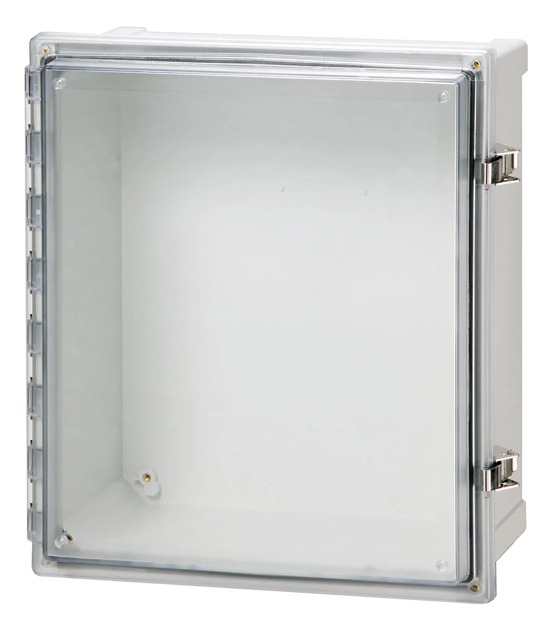 Including: Hinged cover, base with 10-32 brass inserts, latched cover with formed in place PUR gasket, stainless hinge pin. Quick release latches. Enclosure mounting foot kit. Accessory 10-32 screws for panel mounting.