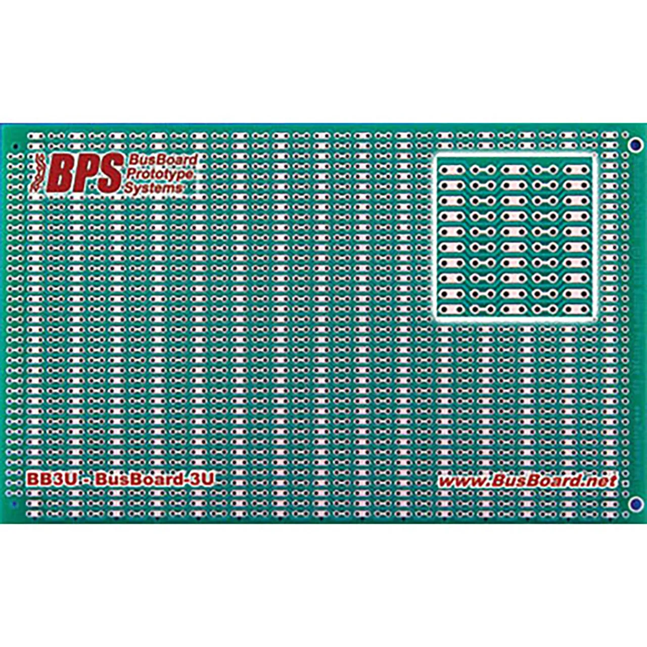 The BusBoard-3U prototyping circuit board has the BusBoard zig-zag circuit pattern which is great for high connectivity I.C. and connector applications. The pattern allows DIP integrated circuits and DIL headers to be connected pin-to-pin without cutting traces or adding wires.Opposite sides of the IC or connector are on separate tracks to simplify wiring. It's ideal for memory buses and it provides easy power and ground connections for other ICs. Narrow and wide tracks identify the connected pads. Indicator holes show which are the wide tracks from the top side. A soldermask provides easy soldering and prevents solder bridges on tracks.