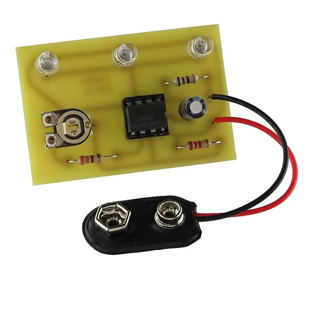 This kit features 3 crystal clear special LEDs which create brilliant flashes of orange-red light. The light output of this flasher kit can even be seen in direct sunlight. You've never seen anything like it! Great for night joggers, bicyclists, warning markers, etc. Size of PC board: 2" x 1.4". Operates on one 9V Battery (not included). Flash rate is adjustable with the built-in trimmer potentiometer. Complete with all parts, PC board and instructions. Skill Level 1.