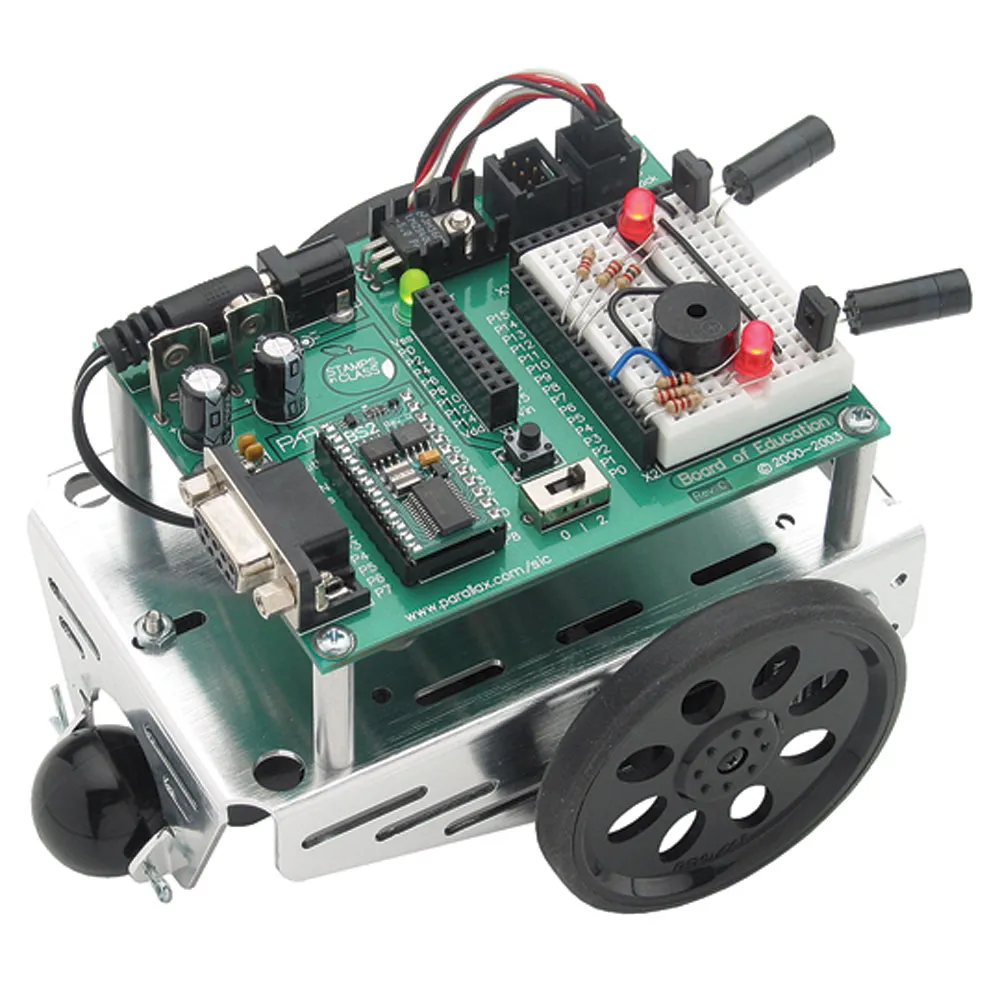 The ever-popular Boe-Bot® Robot Full Kit (serial version) is our most complete reprogrammable robot kit. Build your own roaming robot with a BASIC Stamp 2 microcontroller brain. Follow the clear, step-by-step instructions and illustrations with the included book, Robotics with the Boe-Bot. No programming or electronics experience is needed!The Boe-Bot Robot takes about 1-2 hours to assemble. Each project in the Robotics text provides a unique new experience of wiring and source code tuning. Completing the entire set of projects takes about 50 hours and is suitable for anyone over the age of 13. The USB Board of Education (and BS2-IC) may also be removed to be used as your platform for the other kits in the Stamps in Class series.