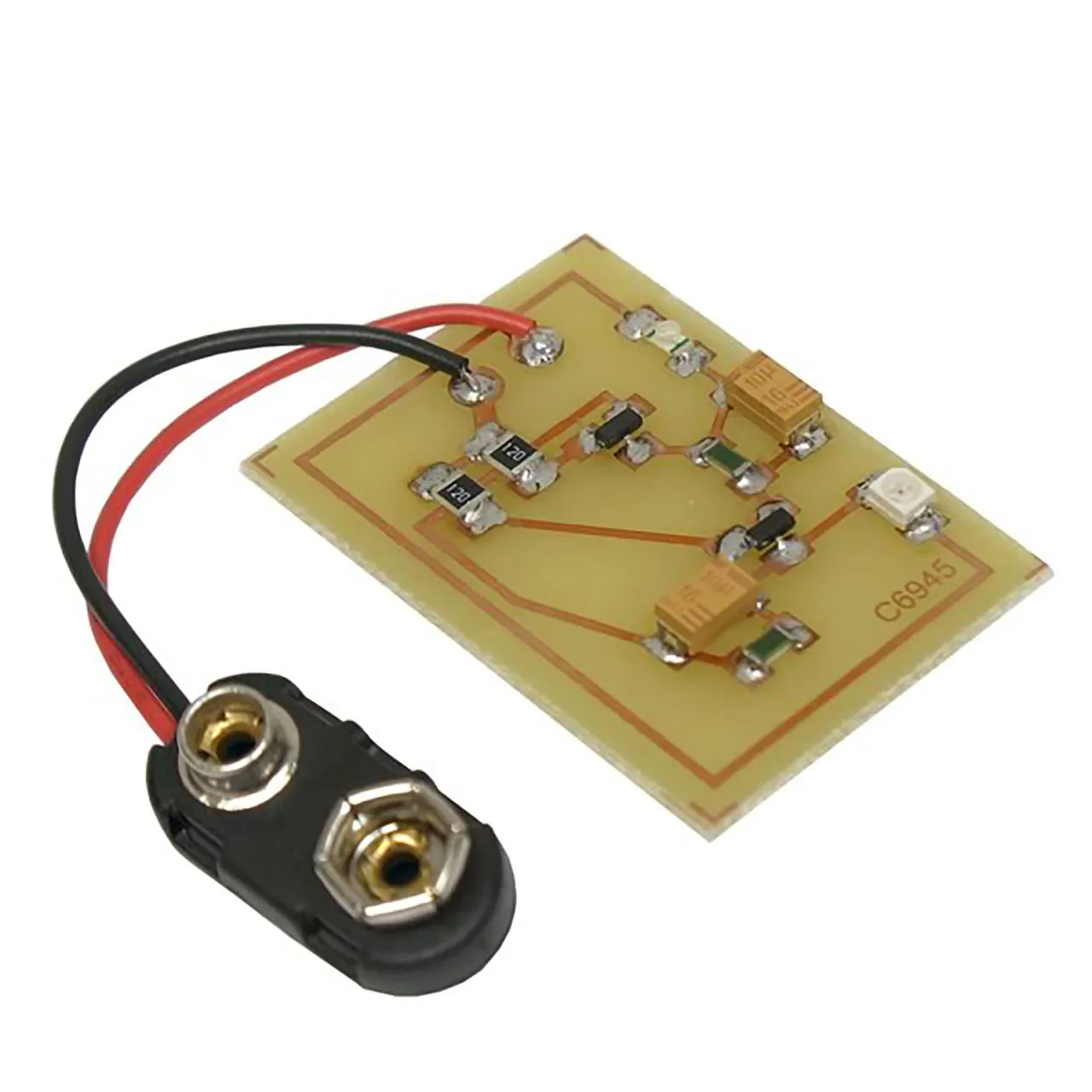 Small brilliant LED flasher alternately flashes one red and one blue LED. Uses SMD (surface mount device) components so there are no holes in the PC board (all components mount to the small foil pads on top of PC board). SMD is the most common technology in use today and this kit provides a nice introduction for your students. Operates on one 9V battery (not included). Size of PC board 1.6" x 1.1". Complete with all parts, PC board and instructions. Skill Level 2.