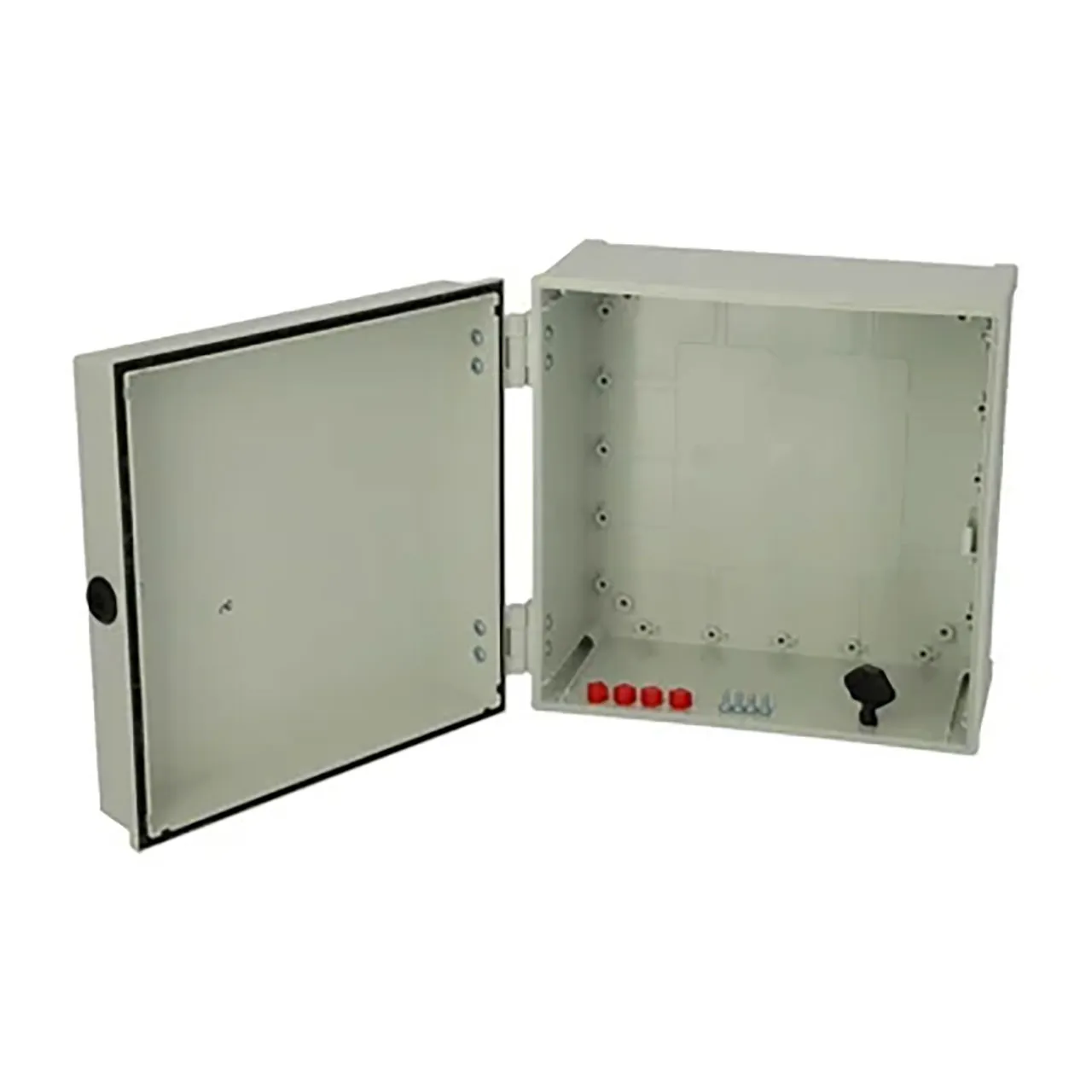 Including: Cabinet base, door with PUR gasket, 3mm double bit lock(s) with key, screws for mounting plate/DIN-rail and corner plugs.