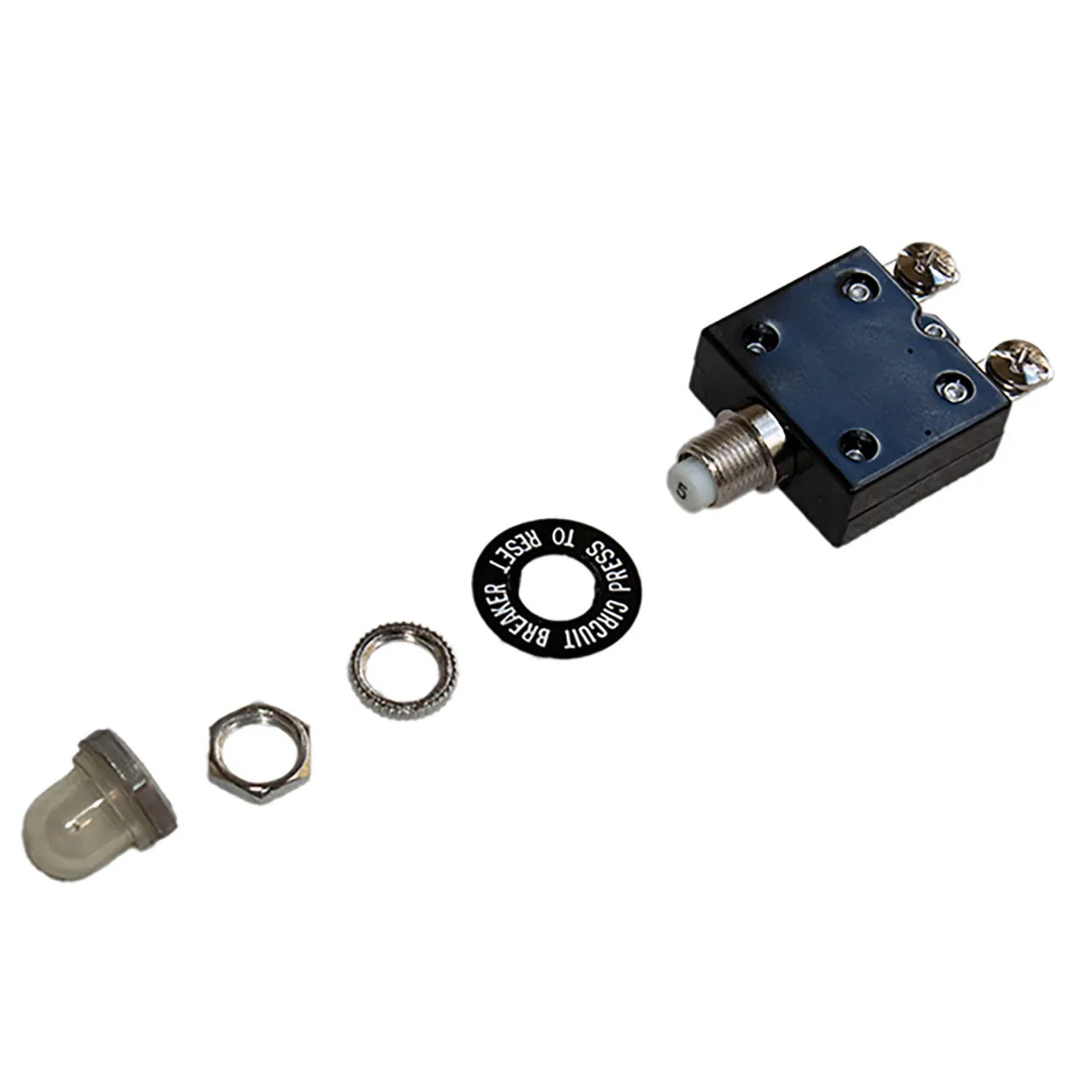 Circuit Protection Circuit Breaker Thermal Black Nameplate Push to Reset 50VDC 250VAC 5A Metal M11 Bushing 8-32 Screw White Button Black Text Metal Nuts V-Spashproof Boot.