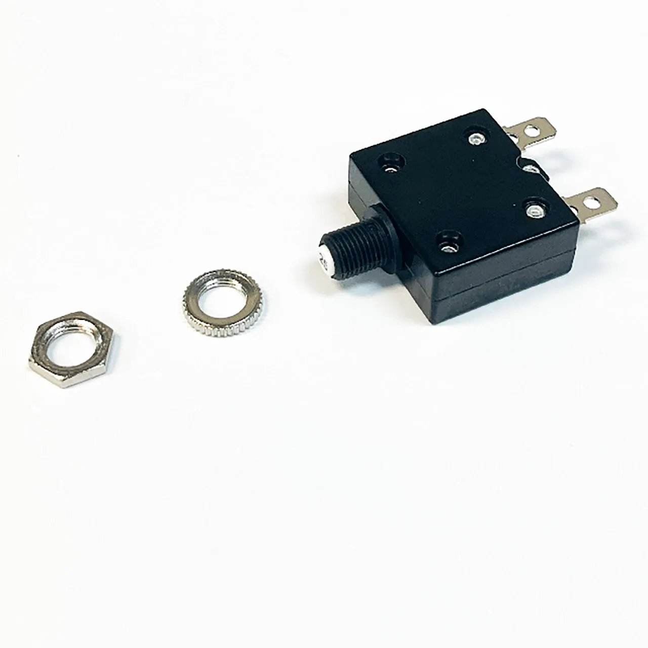 Circuit Protection Circuit Breaker Thermal Push to Reset 50VDC 250VAC 20A Plastic 3/8" Bushing Straight Terminal White Button Black Text Metal Nuts.