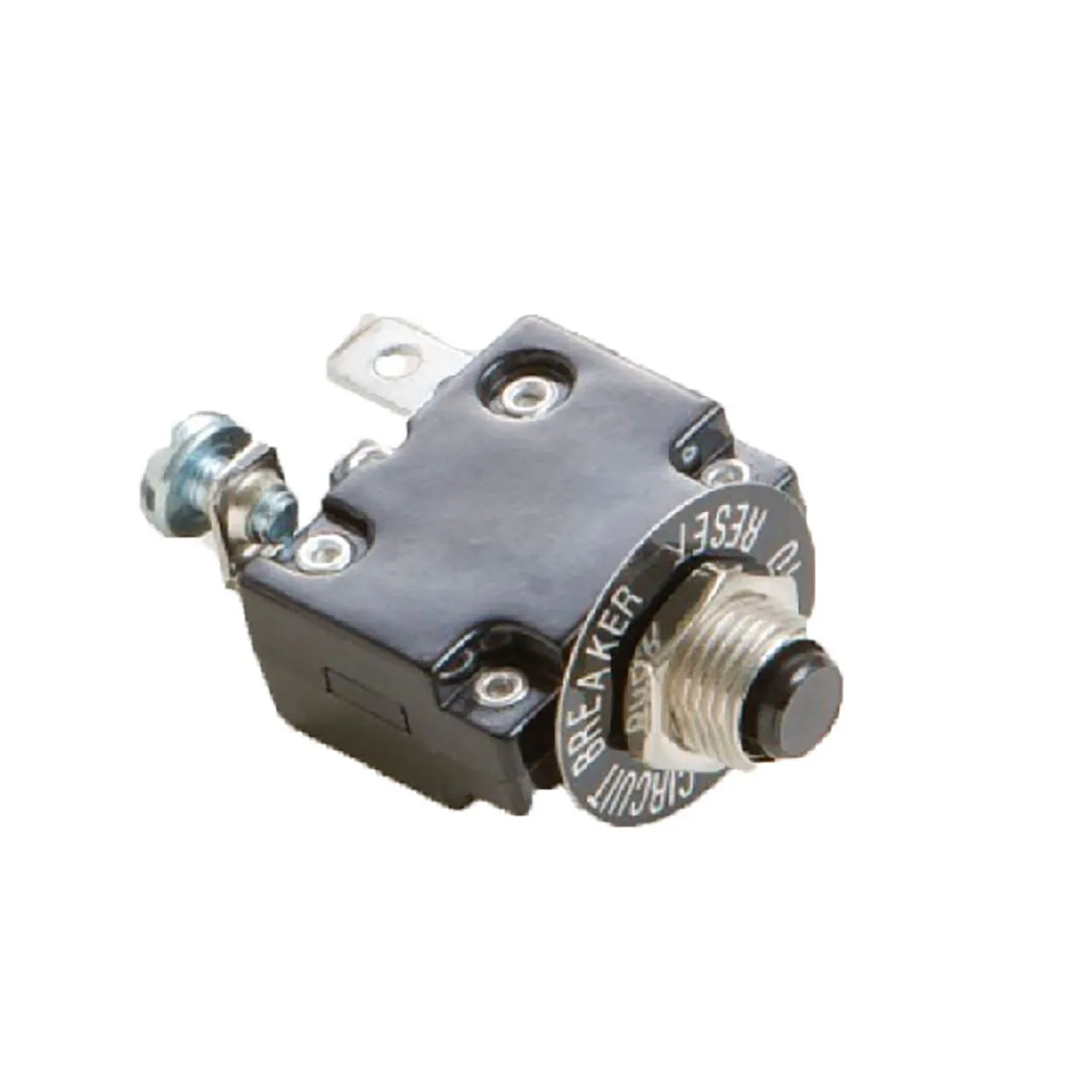 Circuit Protection Circuit Breaker Thermal Push to Reset 50VDC 250VAC 3A Plastic M11 Bushing 8-32 Screw 90° Bend Term White Button Black Text Plastic Nuts