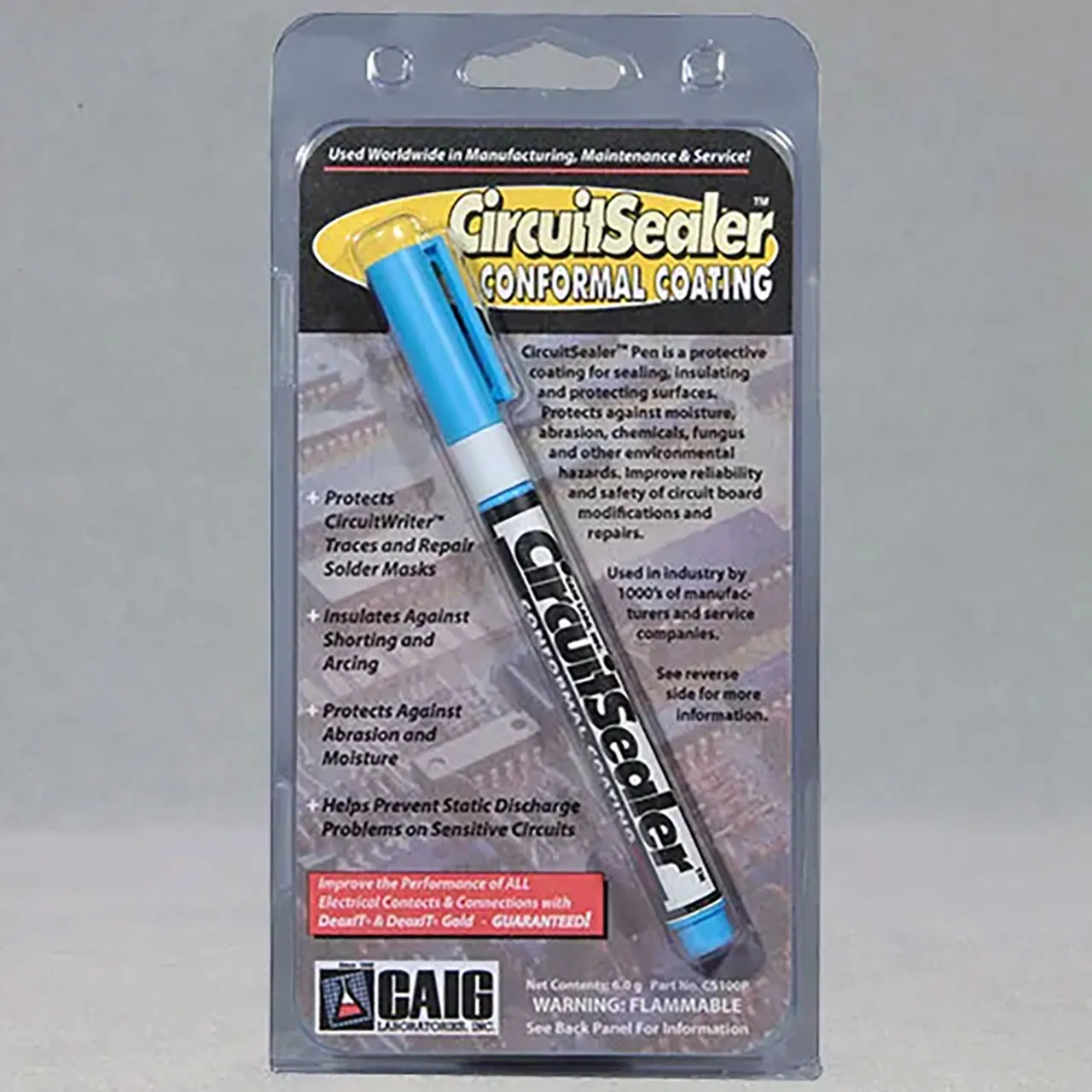 CircuitSealer™ Pen is a protective coating for sealing, insulating, and protecting surfaces. It protects against moisture, abrasion, chemicals, fungus, and other environmental hazards, improves reliability and safety of circuit board modifications and repairs.