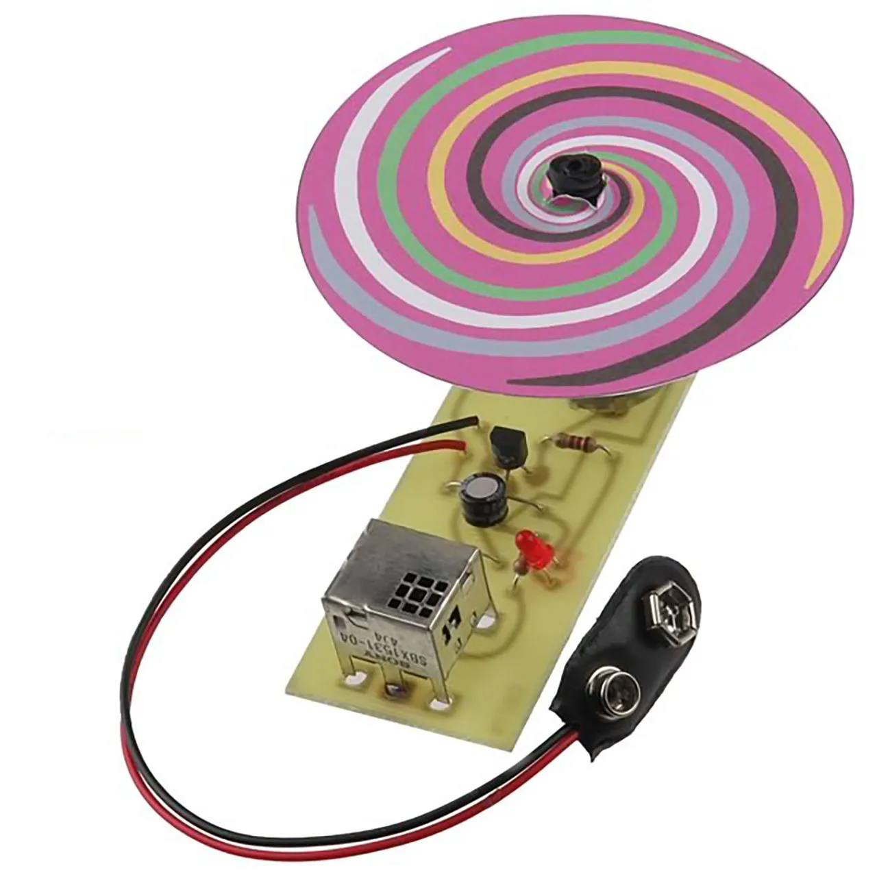 If you're channel surfing with your TV remote control and you get bored, simply aim your remote at this kit and the bright red hypnotic wheel starts rotating. Uses a motor and a sensitive IR module to allow it to operate with any brand or type of IR remote control made. Easy to build kit uses one 9V battery (not included). Complete with all parts, 6 hypnotic wheels, PC board and instructions. Size of PC board: 3-1/8" x 1-1/4". Complete with all parts, spinner, label, PC board and instructions. Skill Level 1. NOTE: You provide the TV IR remote control.